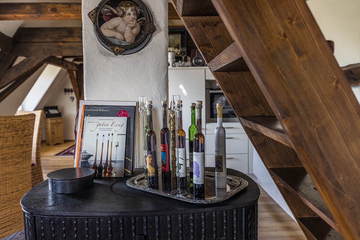In einem der schönsten alten Fachwerkhäuser Venningens haben wir für unsere Gäste das Doktorenhof-Essig-Appartement in der ursprünglichen Gesindewohnung eingerichtet. Dieses kleine Refugium können Sie erleben und gleichzeitig unsere Essige in einer besonderen Atmosphäre verkosten. Die alte Gesindekammer ist noch im Original vorhanden und birgt eine kleine Wohlfühl-Überraschung.
